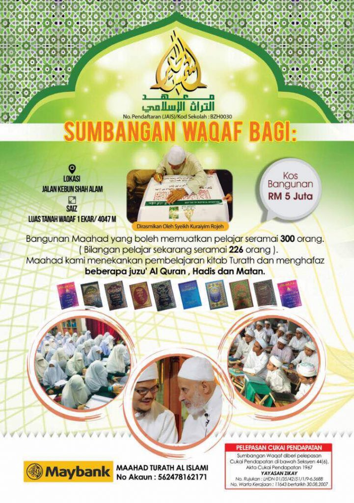 Maahad Turath Al Islami sedang dalam proses mengumpul dana untuk membina kampus maahad di atas tanah wakaf seluas 1 ekar. Pengajian kitab Turath secara talaqqi dari kulit ke kulit juga menitik beratkan hafalan. Maahad Turath Al-Islami - Startside.